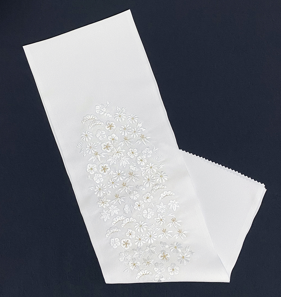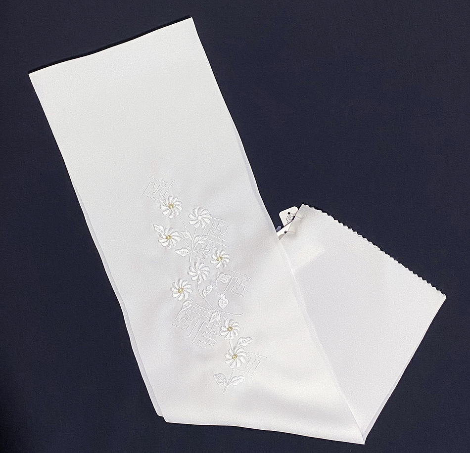 スベリの良い手触りのポリエステルの生地を白に地染めし、サヤガタと枝花の柄を白や金の刺繍で仕上げた品。