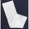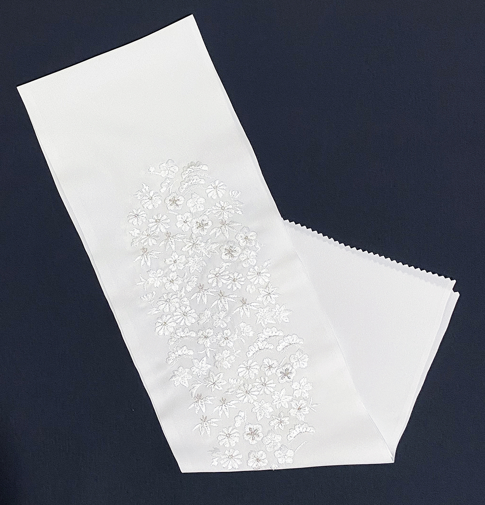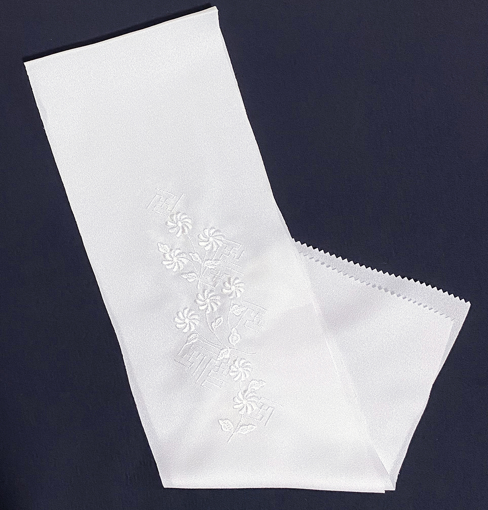スベリの良い手触りのポリエステルの生地を白に地染めし、サヤガタと枝花の柄を白の刺繍で仕上げた品。