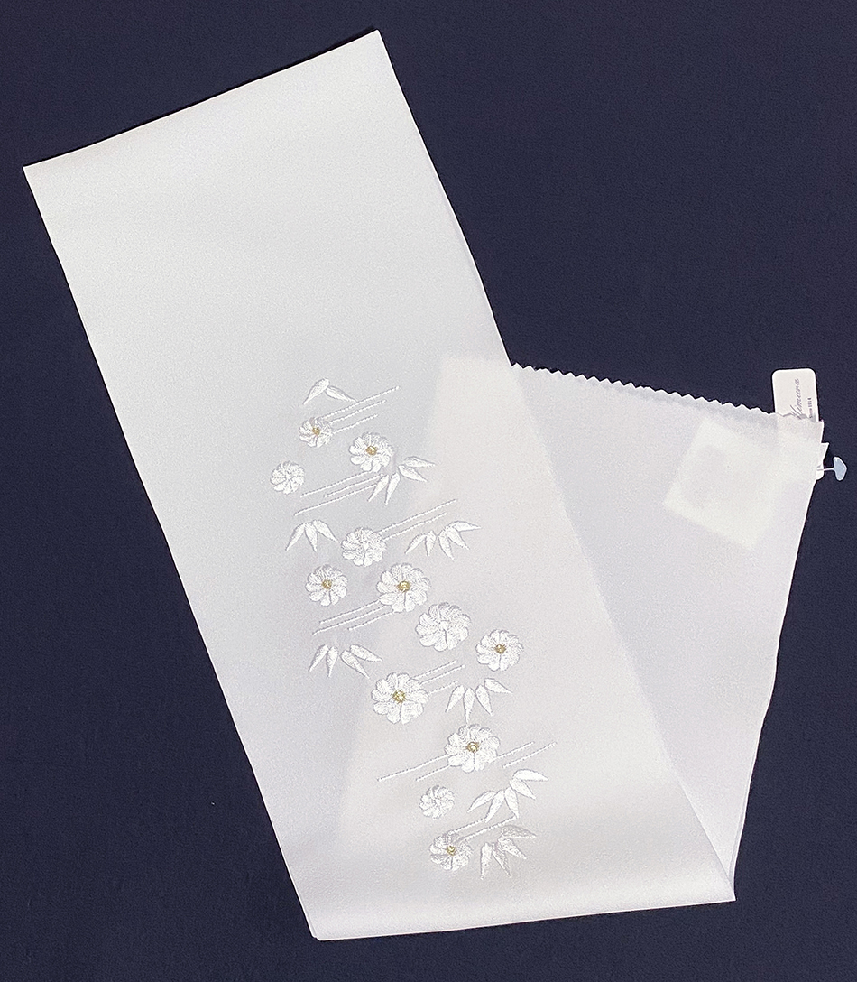 スベリの良い手触りのポリエステルの生地を白に地染めし、竹や小花などの小花の柄を白や金の刺繍で仕上げた品。