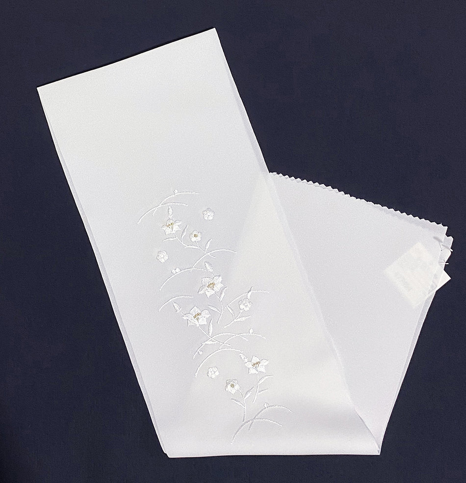 スベリの良い手触りのポリエステルの生地を白に地染めし、露芝と桔梗などの柄を白や金の刺繍で仕上げた品。