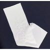 しなやかな手触りの白のポリエステル紋意匠の生地に、蝶と花の柄を白と金糸の刺繍で仕上げた品。