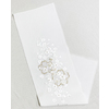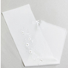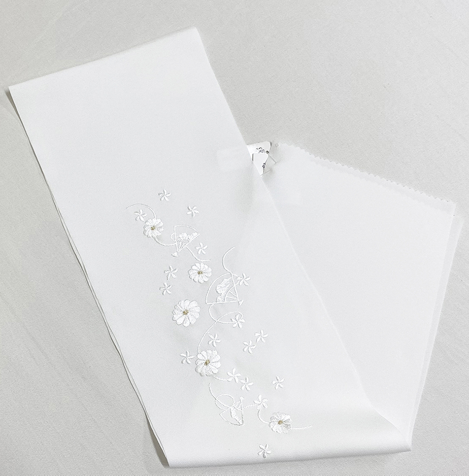 しなやかな手触りのポリエステル白の生地に、扇と小花の柄を白と少しの金糸の刺繍で仕上げた品。
