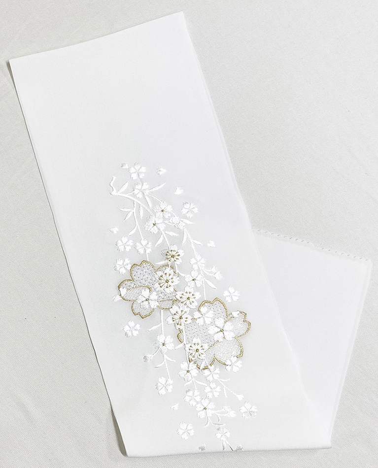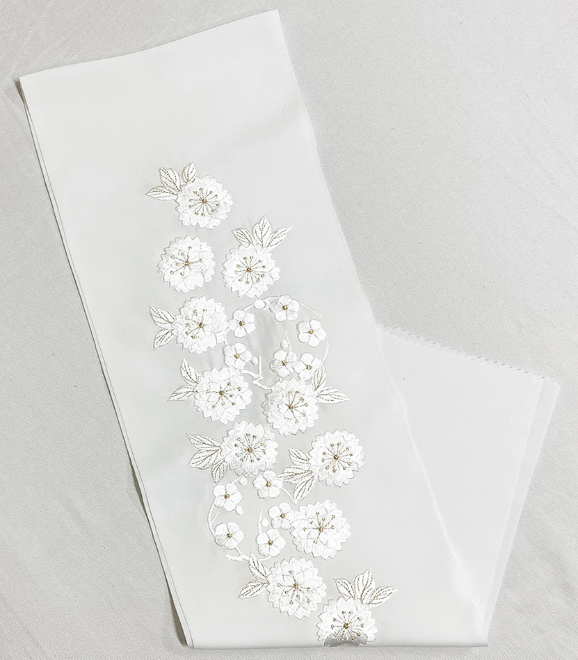 しなやかな手触りのポリエステルの白生地に、八重桜の柄を白と金糸の刺繍で仕上げた品。