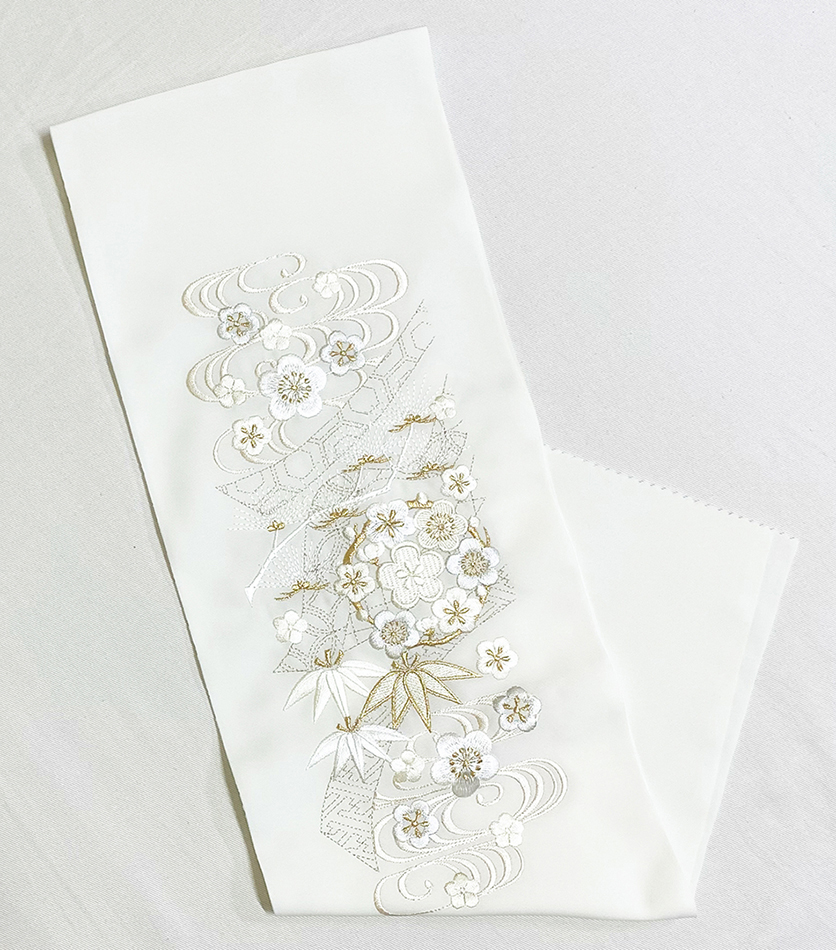 しなやかな手触りのポリエステルの白生地に、観世流水や梅などの柄を白と金糸の刺繍で仕上げた品。