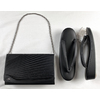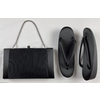 草履は、黒のつや消し台に、バッグと共生地の天と鼻緒で仕上げた品。