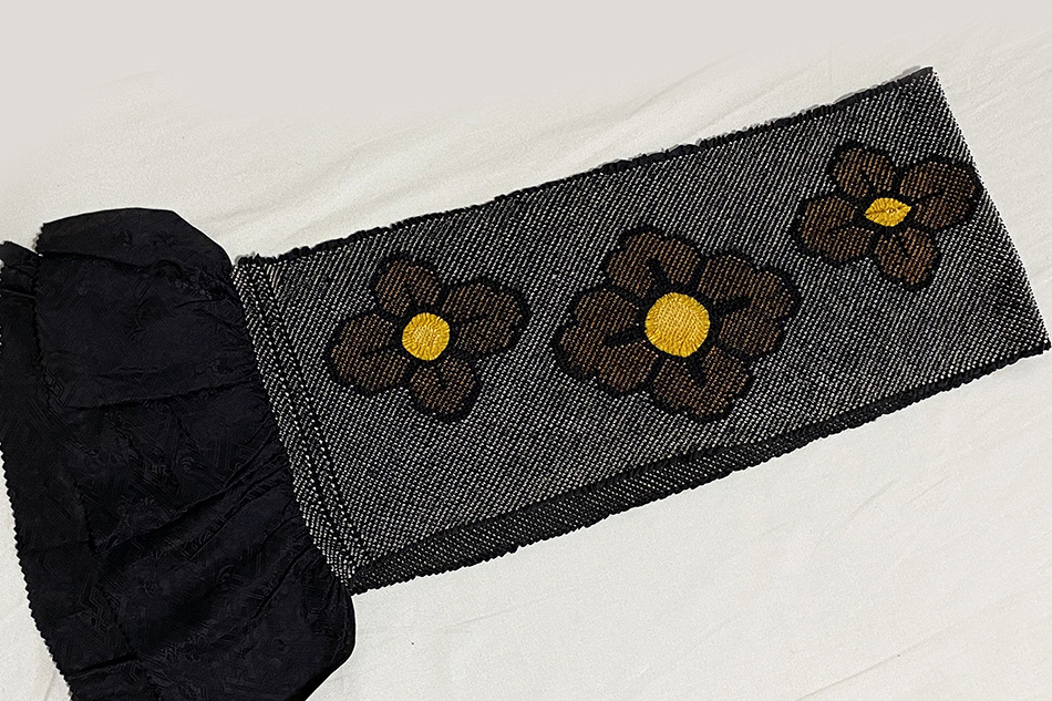 確りとしたサヤガタに花柄を織ったた上質な綸子生地で、黒の地色に白で鹿の子に絞り花柄に黄赤と山吹色を加えた加工の品。