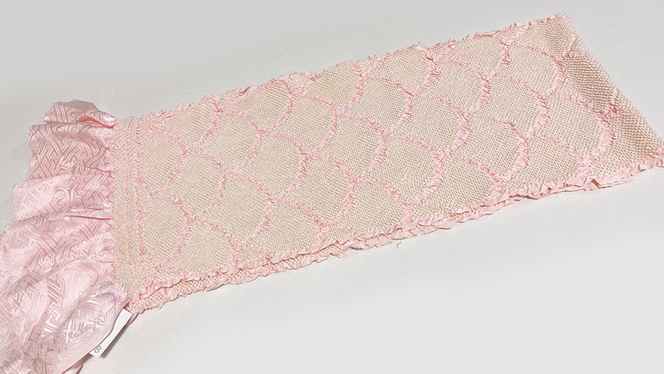 しなやかな手触りのサヤガタに花柄を織り込んだ綸子生地で、淡いピンクの色に波の柄をピンクと白で絞った加工の品。