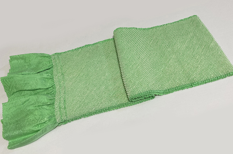 しなやかな手触りのサヤガタと花柄を織った綸子生地で、白と薄緑色で鹿の子柄に仕上げた加工の品。