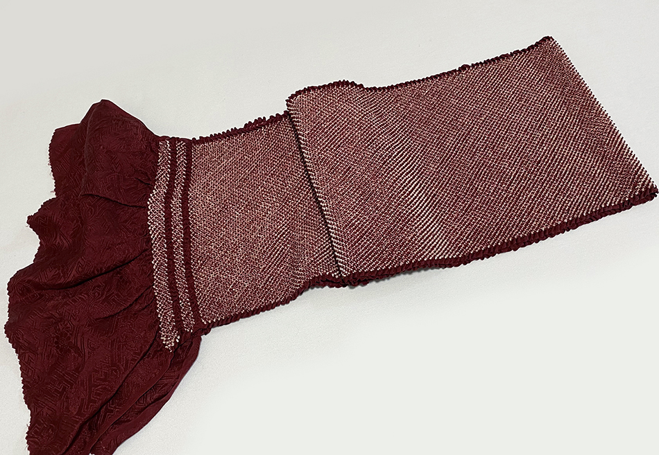 しなやかな手触りのサヤガタと花柄を織った綸子生地で、白とエンジ色で鹿の子柄に仕上げた加工の品。