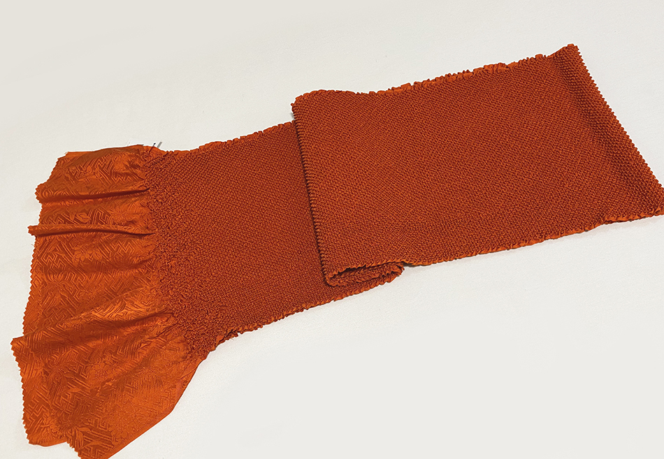 しなやかな手触りのサヤガタと花柄を織った綸子生地で、黄赤に染めた上に絞り加工を施し、両耳に絞りで柄を染めた品。