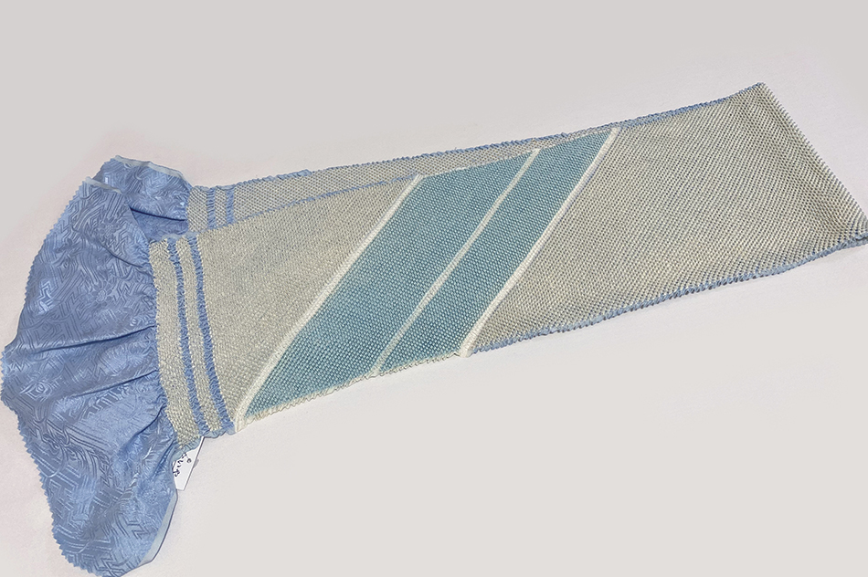 しなやかな手触りのサヤガタと花柄を織った綸子生地で、白に薄水色で全体を絞り、片側には濃いめの緑色と白の斜めの絞りで仕上げた品。