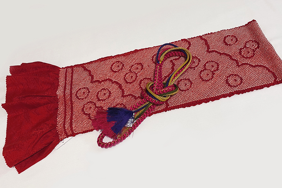 帯締めは、赤と金糸の丸組みで、片側には細い紐で紫色、赤、緑色、ベージュ色、金糸で組み上げた品。