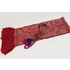 帯揚げは、スベリの良い手触りで光沢のある花サヤガタの地柄を織り込んだ紋綸子の生地を紅色に地染めし、曲線と花柄を生成りの鹿の子絞りと紅梅色の絞り染めで仕上げた品。