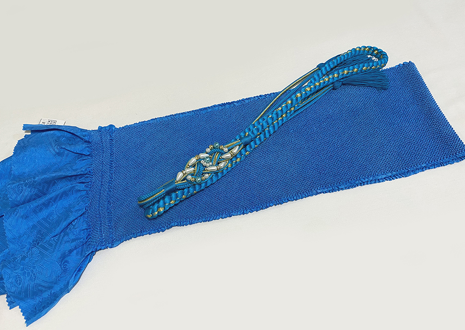 帯締めは、濃い水色に金糸を組んだ丸組みで、片側は細い紐で4本に織り、組み上げた場所には白ネズや金加工の貝を施した加工の品。