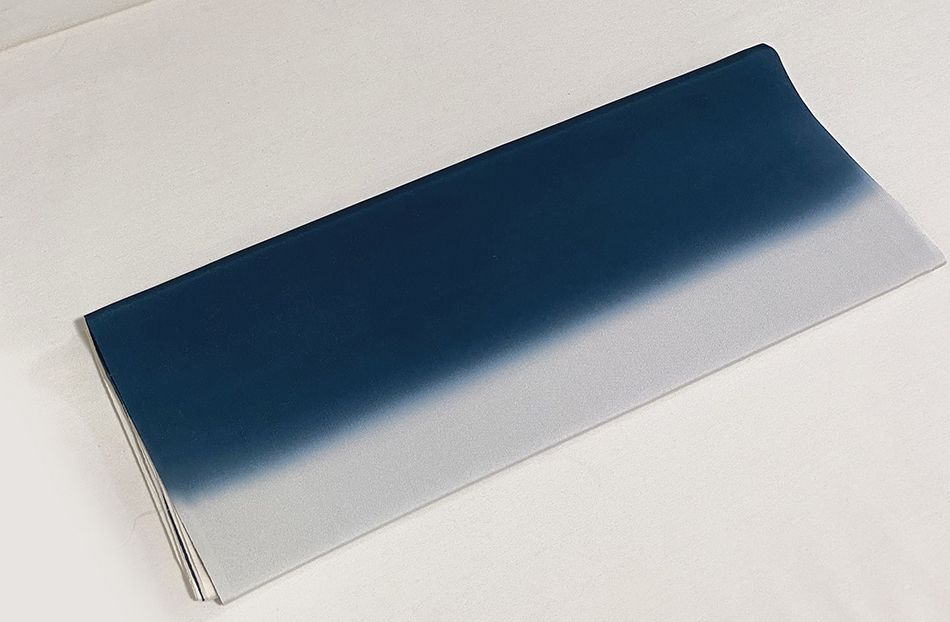 しなやかな手触りのパレス織りの生地を深い紺色の暈しで染め上げた品。