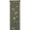 張りのある手触りで細糸で確りと打ち込まれたくすんだ緑みの青磁色の薄手の錦地織りに、手毬と横笛の柄を紫や藤ネズ・エンジ色・ベージュ色・金糸などの唐織りで重ね織りした品。