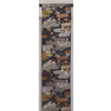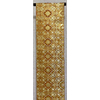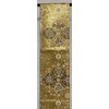 張りのある手触りで確りと打ち込まれたくすんだ濃い紫の錦地織りに、屏風短冊柄を本金箔や艶消しの金糸などで重ね織りし、花鳥柄などを薄紫に青緑・エンジ色などを加え重ね織りした品。