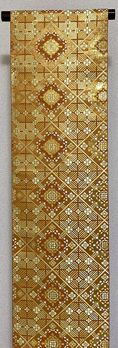 張りのある手触りで確りと打ち込まれた濃い曙色の錦地織りに、金糸・金箔の格子柄と、小花の柄を白ネズで重ね織りした品。