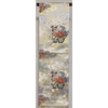 張りのある手触りで確りと打ち込まれたベージュ色に金銀糸を重ねた薄手の錦地織りに、花車の柄を黒や紫・黄赤・薄緑などで重ね織りし、少しの唐織りを加え仕上げた品。
