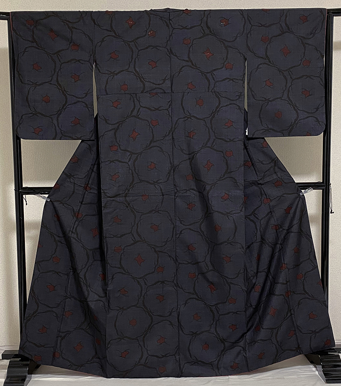 張りのある手触りで細糸で確りと打ち込まれた黒の大島紬の地織りに、花の柄を青ネズやエンジ色の絣で重ね織りした品。八掛けは正絹ルビーレッド色無地で胴裏は正絹が付いた手縫い仕立て。衿裏にはホック代わりに糸が付いています。