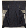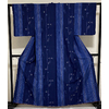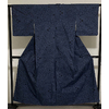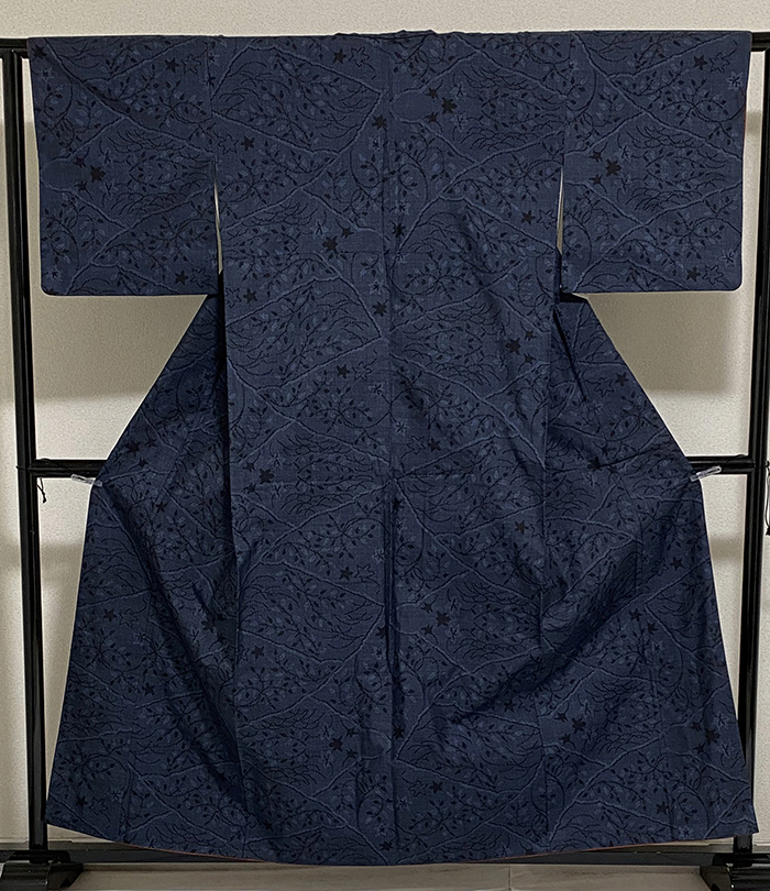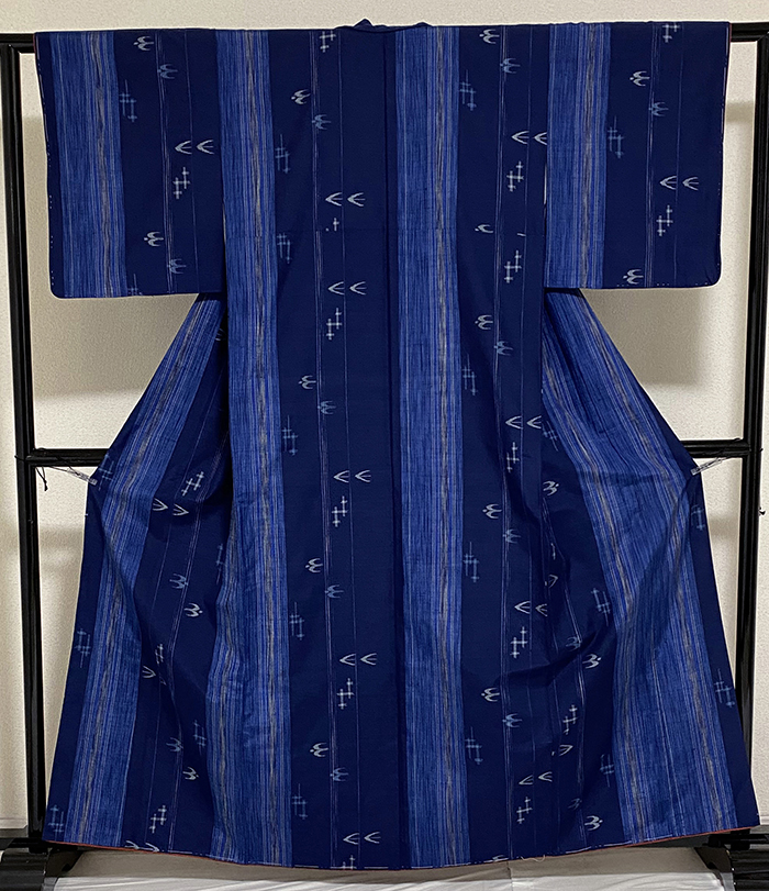 張りのある良い手触りの深い紺色の紬の地織りに、ツバメや縞の柄を青ネズや白ネズで重ね織りした品。八掛けは正絹黄赤無地で胴裏は正絹が付いた手縫い仕立て。衿裏にはホック代わりに糸が付いています。