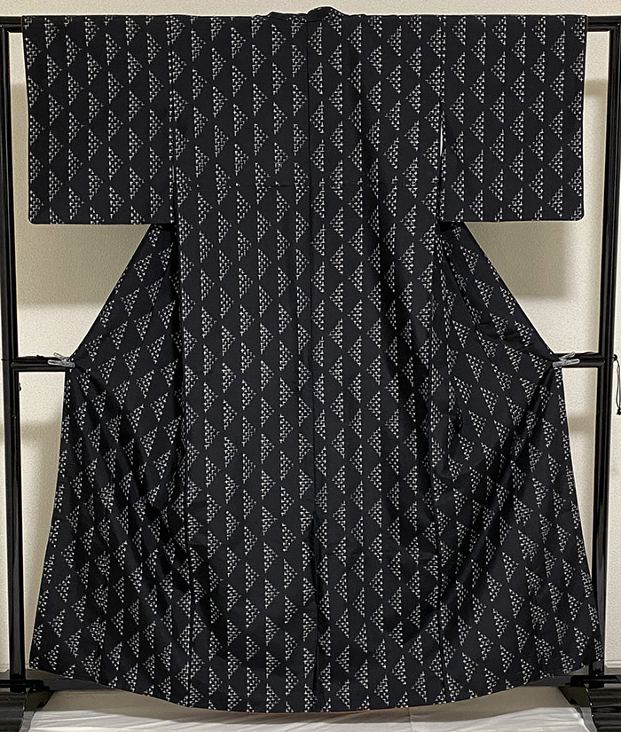 張りのある良い手触りで細糸で確りと打ち込まれた黒の紬の地織りに、三角の柄を白ネズの絣柄で重ね織りした品。八掛けは正絹くすんだ海老茶色無地で胴裏は正絹が付いた手縫い仕立て。