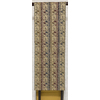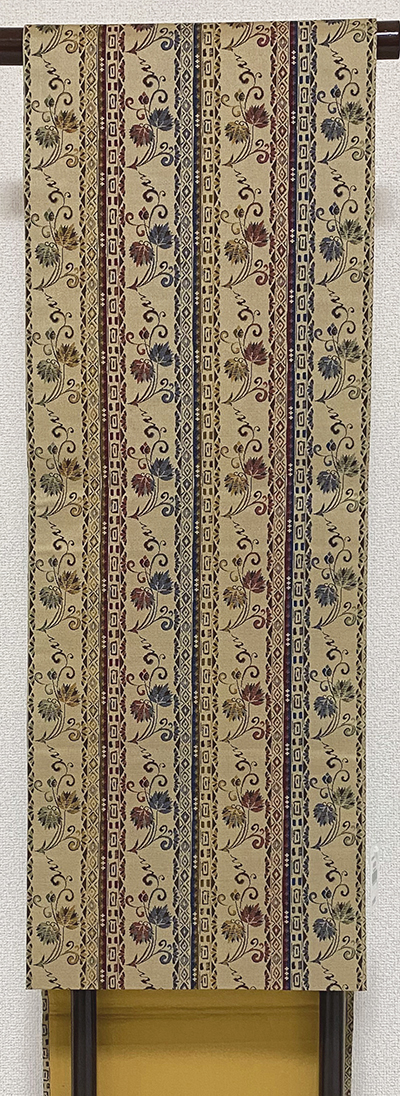 張りのある手触りで確りと打ち込まれたくすんだベージュの紬の地織りに、縞柄と蔓花などの柄を鉄紺色やエンジ色・金茶色などで重ね織りした品。手先まで平仕立てで、木綿の裏地が付いた額縁仕立て。