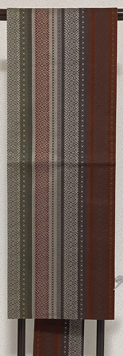 張りのある手触りで確りと打ち込まれた白ネズの錦の地織りに、献上柄をくすんだエンジと白ネズにモスグリーンで重ね織りした品。