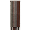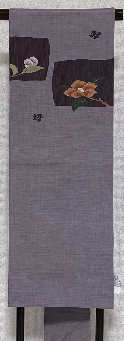 張りのある手触りで確りと打ち込まれた横糸に薄い緑色や紫を重ねたくすんだ藤ネズの錦の地織りに、お太鼓の色紙取り花柄を茶色や深緑色に黒茶などで重ね織りした品。