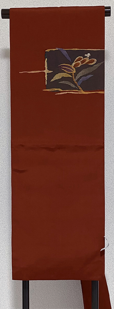 張りのある手触りで確りと打ち込まれたくすんだ赤色の錦の地織りに、お太鼓の花柄を緑色や金茶に青ネズなどのスクイ織りで重ね織りした品。