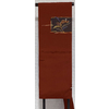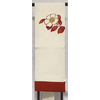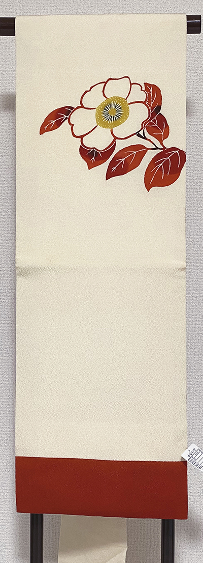 張りのある手触りで確りと打ち込まれた縮緬の生地を生成りに地染めし、お太鼓の花柄を紅色濃淡と金茶や緑などで重ね染めした品。