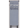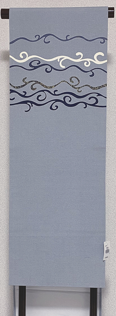 ザックリとした手触りで横糸に少しのフシ糸を織り込んだ紬縮緬の生地を優しい青ネズで地染めし、お太鼓の波柄を鉄紺や白に少しの金糸を加え重ね染めした品。タレの返しに表色の平紬の生地が付いています。手先まで平仕立てで、木綿の裏地が付いた額縁仕立て。