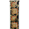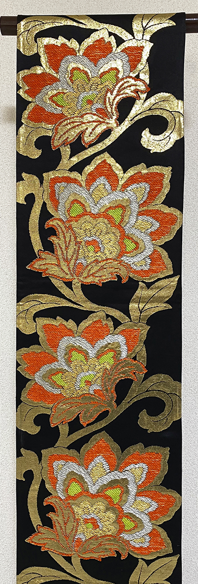 しなやかな手触りで確りと打ち込まれた黒の緞子地織りに、大きな蔓花柄を金銀糸と朱赤・緑色・薄紫などで重ね織りした品。両面仕様。 裏面は、表と同じ色柄の生地が付いています。