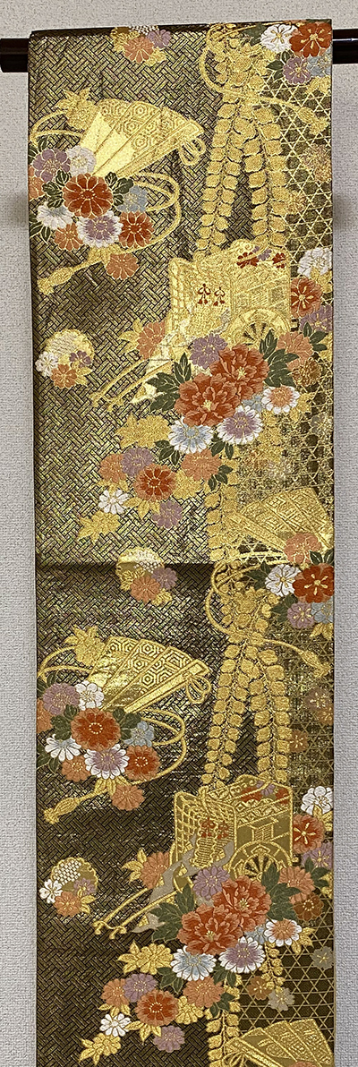 張りのある手触りで確りと打ち込まれた黒に金の桧垣の地柄を織り込んだ豪華な佐賀錦地織りに、御所車や扇に花柄などを薄紫や紅色と緑などの唐織りと、金糸金彩で重ね織りした品。