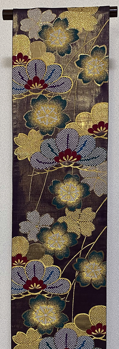 しなやかな柔らかい手触りで確りと打ち込まれたくすんだ紫に金糸を重ねた錦地織りに、花柄をエンジ色や紫・緑色・白ネズなどに金糸を加え重ね織りした品。