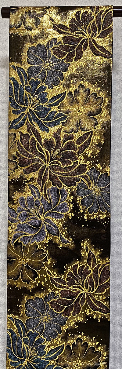 張りのある手触りで確りと打ち込まれた黒の錦地織りに、金糸の暈しと、松や花柄を青紫や赤紫などのラメ糸で重ね織りした品。