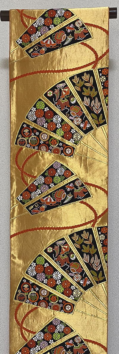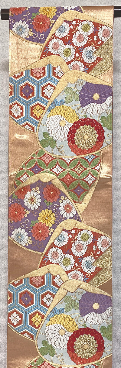 張りのある手触りで確りと打ち込まれた朱色に金糸を重ねた錦地織りに、扇と花や宝尽くしなどの柄を黒に黄緑色や黄赤や金銀糸など重ね織りした品。