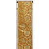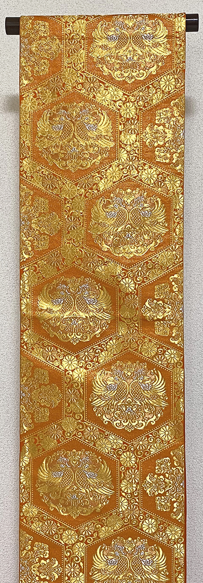 張りのある手触りで確りと打ち込まれたオレンジ色の錦地織りに、亀甲や花に鳳凰などの柄を金銀糸で重ね織りした品。服部織物謹製、タレ返し部分に機屋マークがあります。