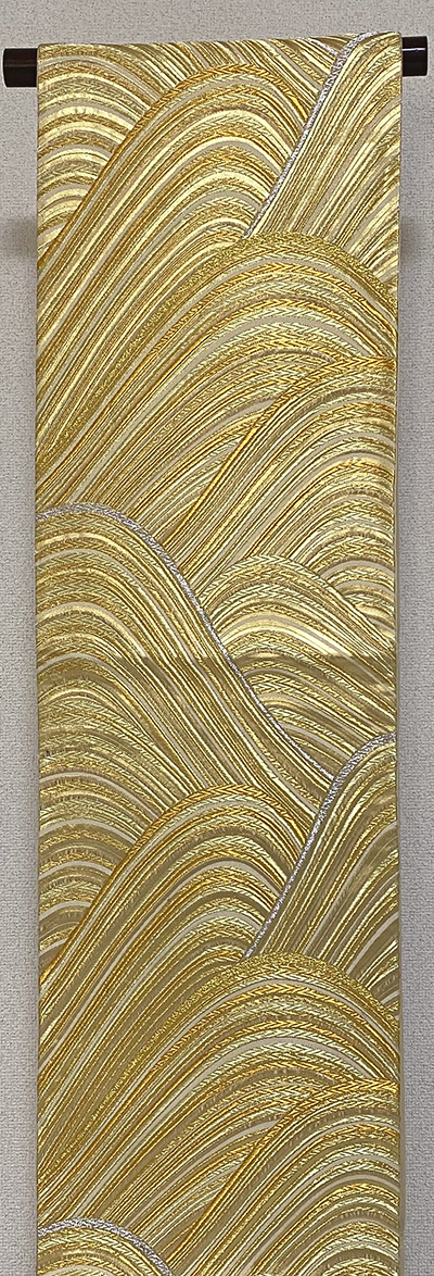 張りのある手触りで確りと打ち込まれた生成りの錦地織りに、波柄を金銀糸と柔らかなオレンジ色や淡い黄緑色の色金糸を加え重ね織りした品。