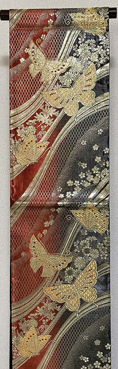 張りのある手触りで確りと打ち込まれた黒と紅赤に金糸を重ねた薄手の錦地織りに、花や蝶の柄を薄オレンジ色や緑色・紫などのラメ箔に金糸を加え重ね織りした品。