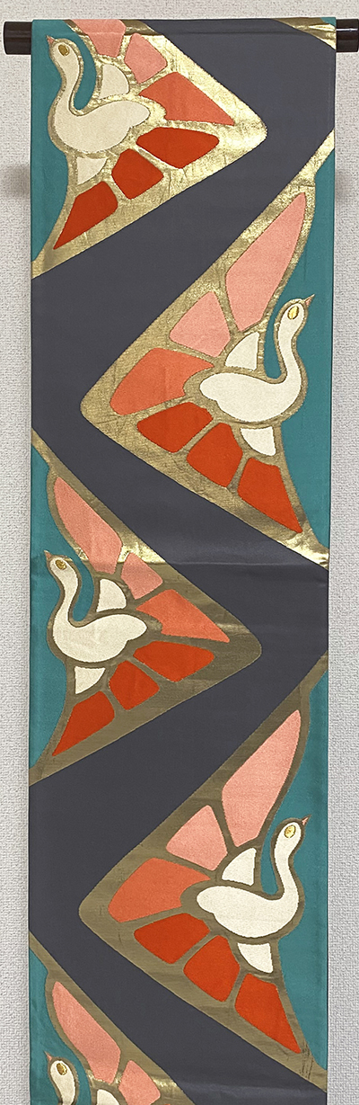 張りのある良い手触りで確りと打ち込まれた墨色の錦地織りに、鶴の柄を青緑色や赤に珊瑚色などに金糸金箔を加え重ね織りした品。
