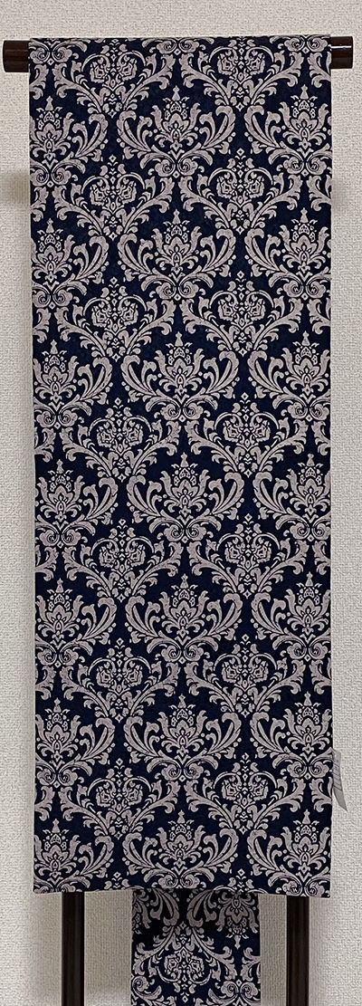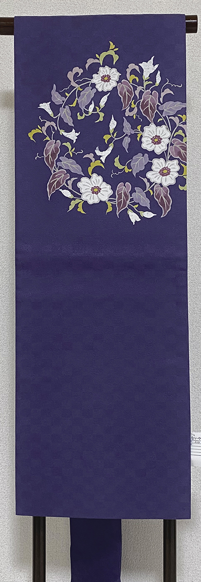 張りのある手触りで確りと打ち込まれ小さな市松の地柄を織り込んだ紋意匠の生地をくすんだ青紫色に地染めし、お太鼓の蔓花の柄を白ネズや薄藤・くすんだ黄色・赤紫など重ね染めした品。
