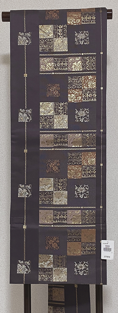 張りのある手触りで確りと打ち込まれた濃いチャコールグレーの錦の地織りに、四角取り花柄を白ネズや薄小豆に金糸などで重ね織りした品。