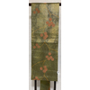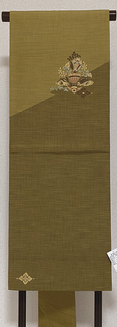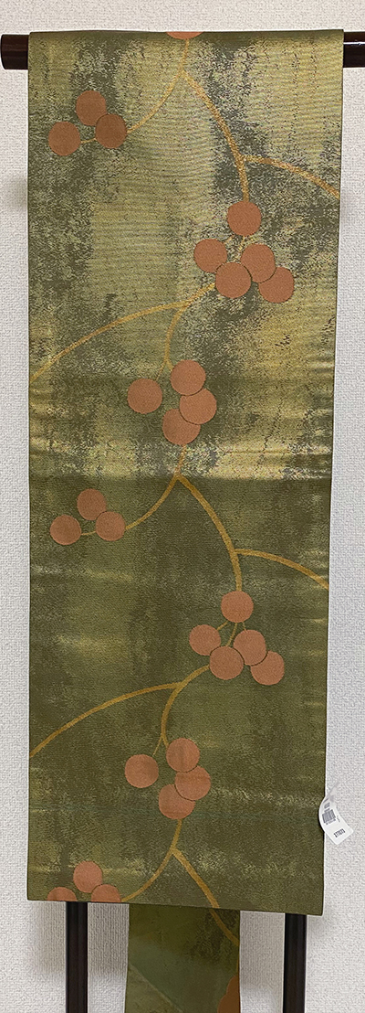 張りのある手触りで確りと打ち込まれたくすんだ緑色に金糸を重ねた錦の地織りに、枝と実の柄を金と今様色で重ね織りした品。