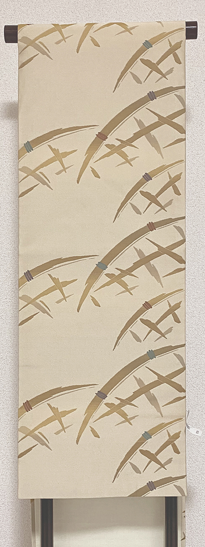 しなやかな手触りで確りと打ち込まれたベージュ色の錦の地織りに、光悦垣の柄を金茶や少しの紫や緑など重ね織りした品。手先まで平仕立て、裏地が付いた額縁仕立て。