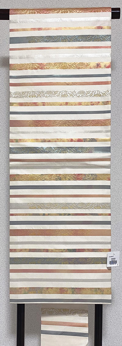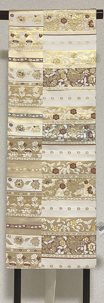 張りのある手触りで確りと打ち込まれた白の錦の地織りに、横段花柄を金糸金箔とエンジ色やグレーなどで重ね織りした品。