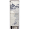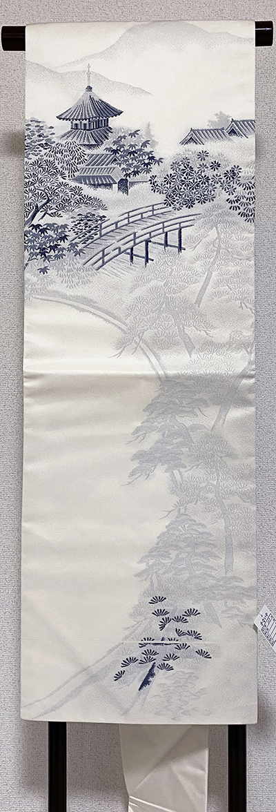 張りのある手触りで確りと打ち込まれた白の錦の地織りに、松と橋など景色の柄を青ネズ濃淡と白で重ね織りした品。