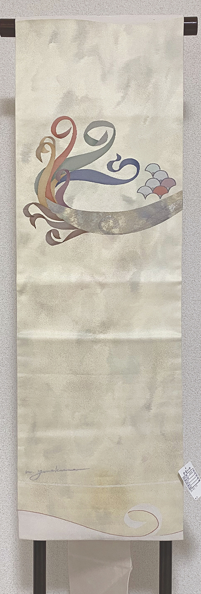 張りのある手触りで確りと打ち込まれた生成りに少しの薄ネズと紅梅色を暈しを重ねた錦の地織りに、お太鼓の抽象柄を黄赤や茶色に赤紫と青ネズに銀糸を加えて重ね織りした品。タレ上に作家名が入っています。