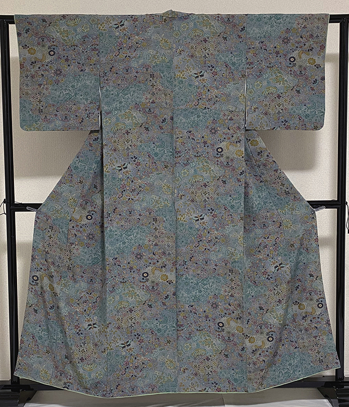 しなやかな良い手触りの一越の生地をグレーに地染めし、蔓花の柄を緑色濃淡で染め、花鳥柄を金茶色や黄赤色に墨色などを重ね染めした品。八掛けは正絹薄緑色暈しで胴裏は正絹が付いた手縫い仕立て。衿裏にはくるみホックが付いています。