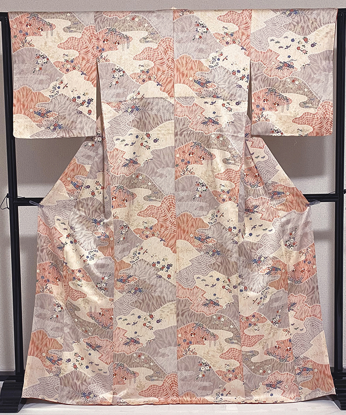 しなやかな手触りで光沢のあるサヤガタの地柄を織り込んだ紋意匠の生地を白ネズに地染めし、花鳥柄を淡い珊瑚色や薄紫と黄赤などで染め、全体に金彩を重ね染めした品。八掛けは正絹黄赤暈しで胴裏は正絹が付いた手縫い仕立て。